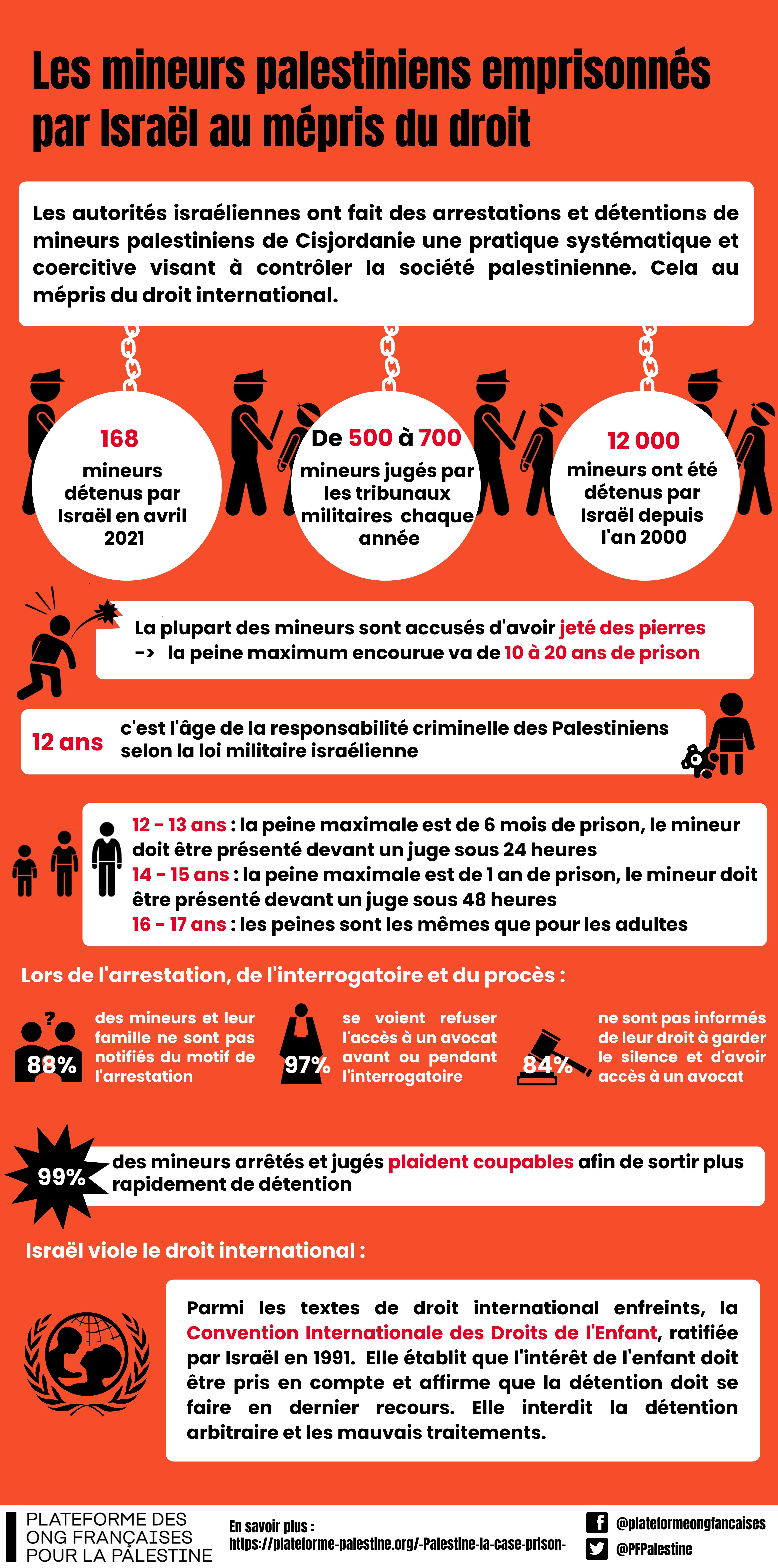 A l’occasion de la Journée de solidarité avec les prisonniers palestiniens, n’oublions pas les enfants emprisonnés arbitrairement par les autorités israéliennes, ils sont aujourd’hui 168 !